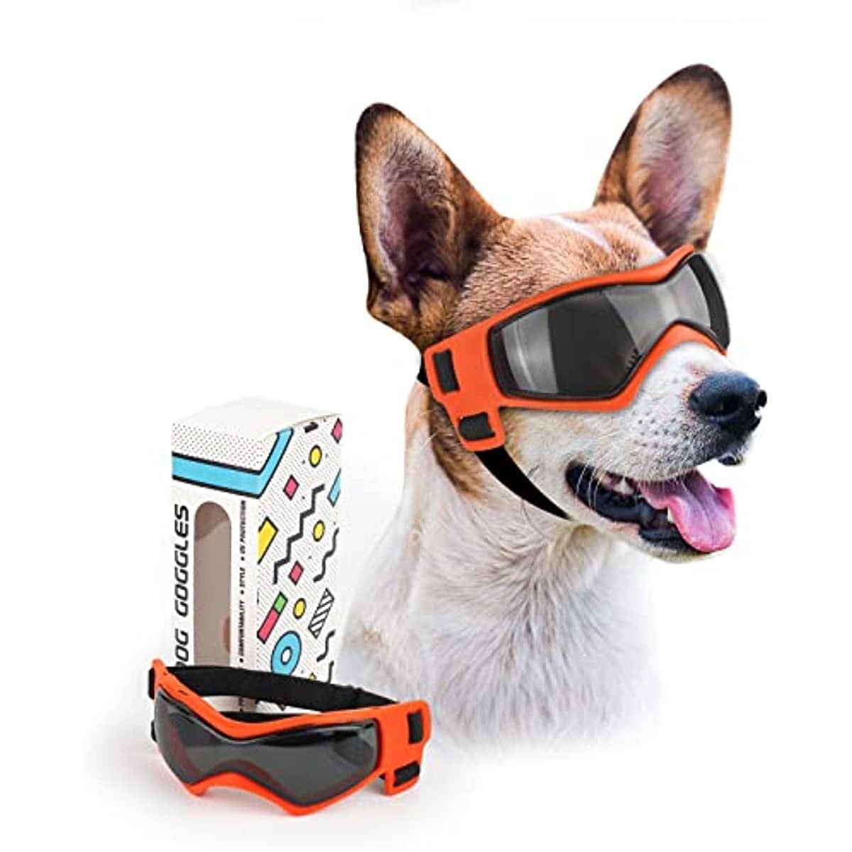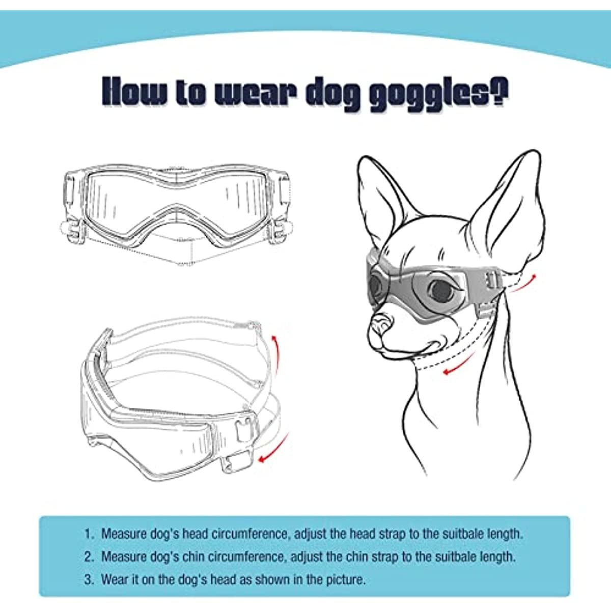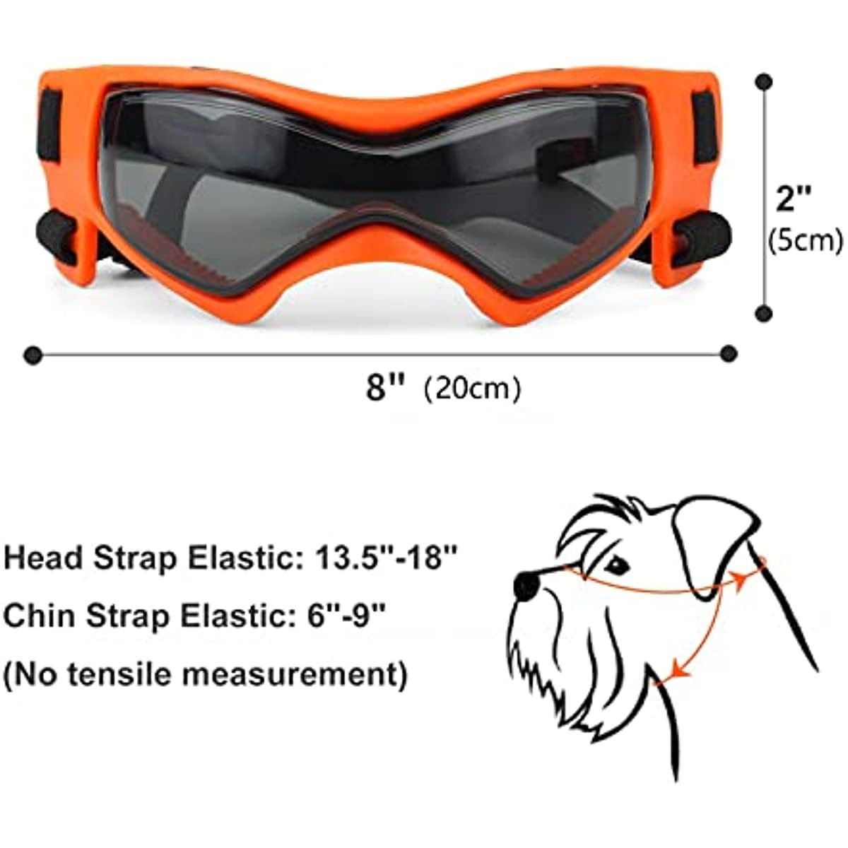 Easy to wear: 2 adjustable and elastic straps on the dog goggles; suitable for small to medium-sized dogs like Corgi; Shiba Inu; Beagle; Medium-sized Poodle; not suggest for small Chihuahua. Curved design lens: In order to make the dog glasses suitable for dog's face and nose; these sunglasses are specially designed with curved lenses. Soft frame with vents: The dog sunglasses frame made of soft rubber; with comb shape vents; make it comfortable for dog to wear; also there won't be water mist on the lens. Cool eye protection: Lens are made of high-quality polycarbonate; which can filter and reduce UV; Infra Red and visible light intensity. Protect your pets' eyes from snow; UV; wind and dust. Size: Length: 8'; width: 2'; adjustable length of head strap: 13.5'-18'; adjustable length of chin strap: 6'-9'. Please measure your dog before purchasing.